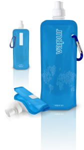 Today I bring you an extremely simple but awesome product: the Vapur water bottle. This puppy is a foldable, reusable bottle designed to go anywhere (when empty anyway). You can roll it up and throw it into your pocket, purse, knapsack, or suitcase and fill it up when you arrive at your destination (or en route) or have a simple way to be rid of the thing when you’re done with it.
