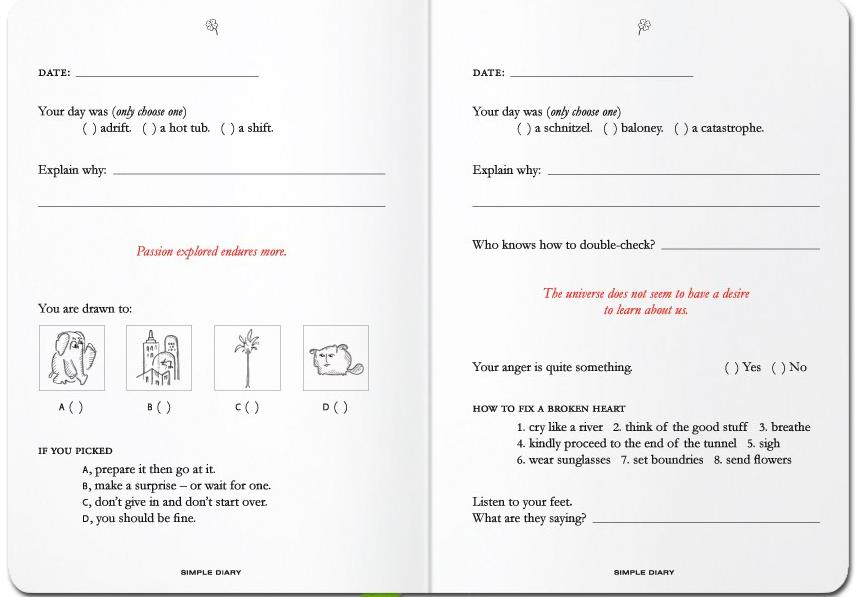 The Simple Journal aims to overcome those woes by giving you a simple question to choose a word to describe your day, space to write a sentence about why it was so, and a few other random musings, questions, and thought spaces. Sometimes the book can be a little bit rooted in the abstract, but its aim is to both make you reflect and make you smile.