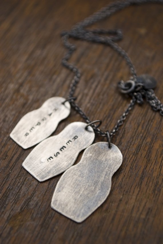It’s not often I handpick an item from Etsy to be featured on this blog, but today’s suggestion is just too cool to keep to myself. It’s a nesting doll necklace. You know, those Russian, oblong wooden dolls that conceal their smaller-sized siblings within? The only difference is, this one is made from metal, stacks, and can be worn around your neck.