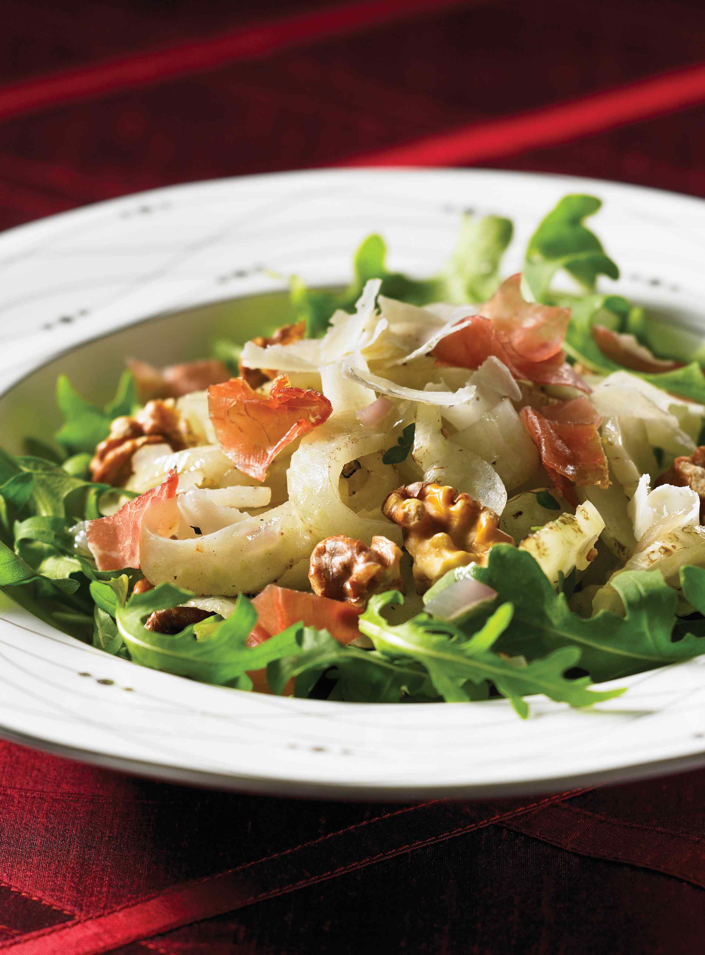 5. Divide arugula among 6 chilled plates and arrange roasted fennel decoratively on top. Sprinkle prosciutto and walnuts over top and garnish with Parmesan curls.