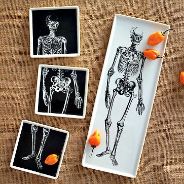 Perfect as a hostess gift – with a side of candy corn – these trays come in two complementary styles: the split three-ways mini trays on the left, and the single white tray on the right. Stack em, serve em, and spook your guests (or giftees) with this fun and freaky gift idea.
