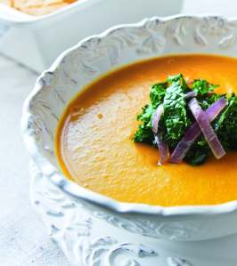 Once you’ve got the squash baked, this soup comes together quickly. The mellow flavors of squash, kale, and red onions synergize delectably and look gorgeous together as well.