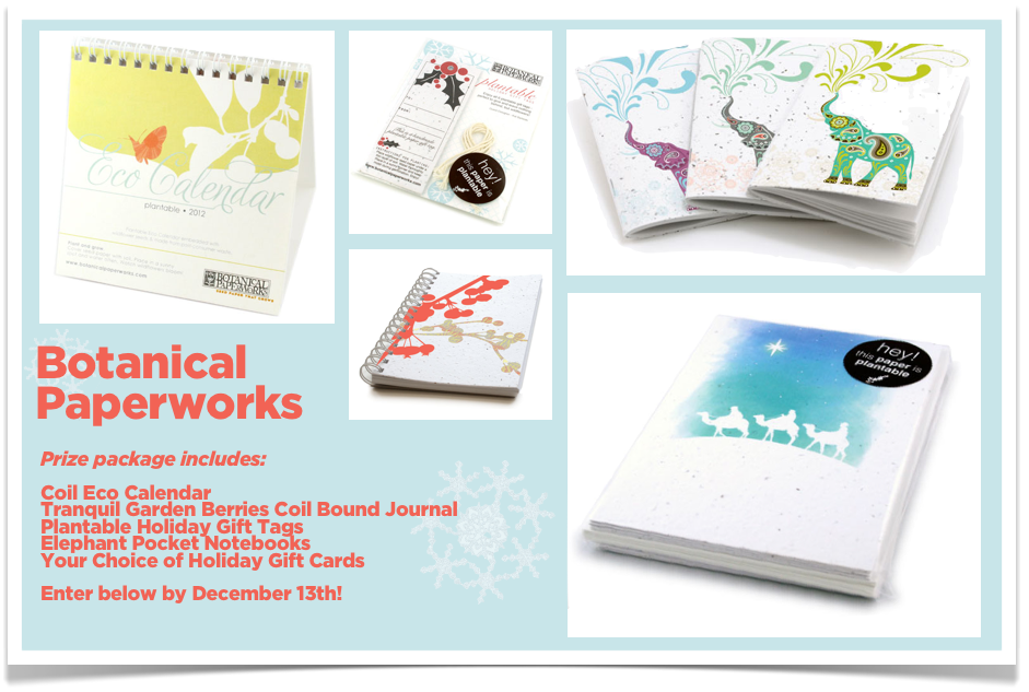 Consider this my call for you to run out (or click over) and grab some awesome Christmas cards and paper products for your holiday gift-giving this year. To give one lucky reader a head start, I’m giving away a package of goodies from Botanical Paperworks valued at $70 including everything you see in the picture above AND your choice of one of the packs of plantable Christmas cards (personally I adore the two-fer set featuring the Peace Dove & Christmas Tree). Here’s how you enter: