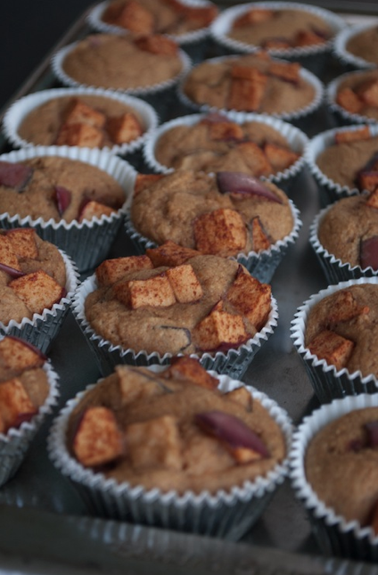 In a large bowl, whisk flour, salt, baking powder, baking soda, ½ to ¾ tsp cinnamon (your choice) plus a dash of nutmeg or ginger, and stir to combine. Whisk in sugar then pour in milk mixture. Add vanilla and remaining ½ cup apples and stir to combine.