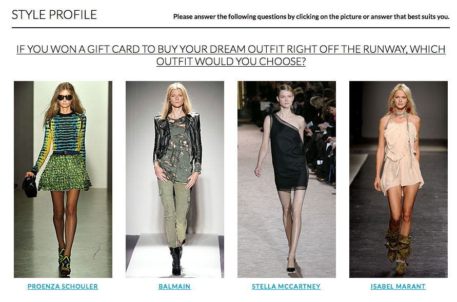 But here’s where things get ultra-cool. Not every girl is going to dig a tribal bangle, and others might have a serious dislike for chunky cocktail rings. So before you start shopping, you fill out a custom Style Profile: ten simple questions that test your gut reactions to everything from style icons and dream designers to preferred nail polish colours and perfect purses.