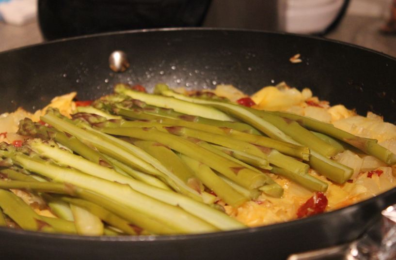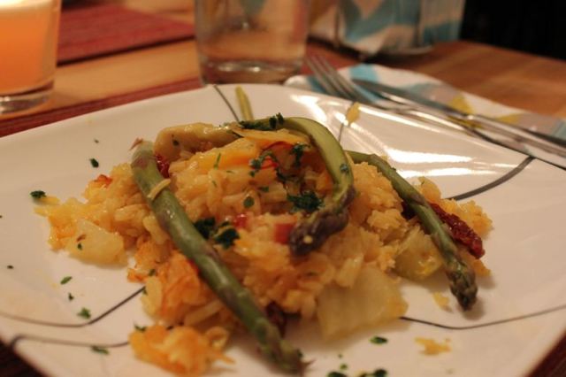 2. Remove pan from heat and scatter asparagus and green olives over rice. Cover pan and bake in preheated oven until rice is tender with a slightly crusted bottom, about 30 minutes.