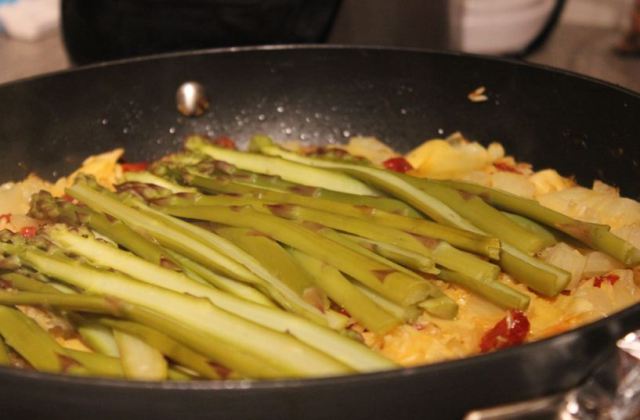 With the colors of a Spanish landscape, this richly flavored one-pan meal is fun and festive. Dinner on the deck and a pitcher of sangria; now that’s relaxing. As cooking with seasonal vegetables produces superior flavors, use green beans if asparagus is unavailable.