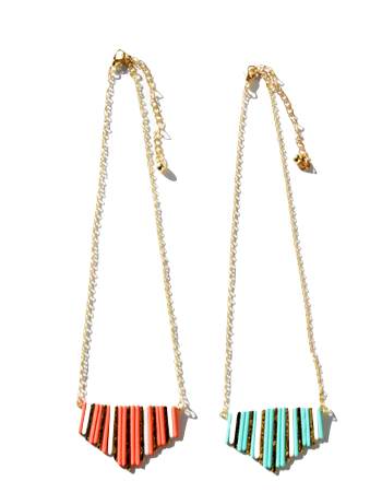 There’s something that feels almost Aboriginal about these triangle pendants made from slats of resin beads. The striking coral and teal variations are set off by crisp white and dappled gold for an eye-catching decolletage decoration, plus the long length makes them uber versatile. I love the idea of one of these tucked into your Mother’s Day gift, alongside a complementary blouse or cardigan.