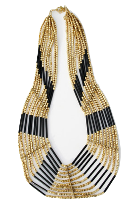 This piece I love simply because while it may look loud will all those layers of gold & black beads, it’s actually extremely versatile. Make it the centre of attention by wearing it over a simple solid coloured dress, or layer it under a blazer and over a tank for a daytime look. The style frames the face beautifully and works with just about any woman’s wardrobe, young or old. Love.