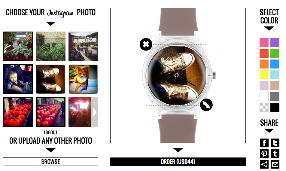 What It Is: A fun & easy-to-use online module to turn your Instagram photos into digital art, namely, in the form of a custom designed watch. Simply log in with your Instagram account, select a photo (yup those are my shoes above), place it accordingly, select your band colour, and presto, you’re a few clicks away from a one-of-a-kind watch. Incidentally Instagram is not required – you can also just upload a favourite photo.
