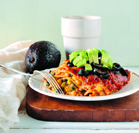 Toss the avocado with the lime juice, then top the baked lasagna with the avocado mixture and olives. Slice and eat!
