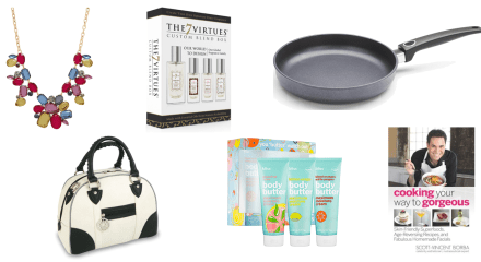 Filed under All That Glitters, B(u)y The Book, Beauty & The Best, Body Break, Compliments To The Chef, Dress You Up In My Love, Fit and Phat, Purse-nal · Tagged with Bags, Bliss, Book, Bowls, Canadian, Cookware, Drake General Store, Eyeshadow, Fair Trade, Fiction, Frying Pan, Gift Set, GiveLoveCycle, Hudson's Bay, Jewellery, Jewelry, La Vie En Rose, Ladies Choice, Laura Mercier, Mom, Nonfiction, Norah Ephron, Pangea Direct, Perfume, PJs, R.J. Graziano, Scott-Vincent Borba, Sephora, Sleep, Sleepwear, The 7 Virtues, The Bay, The Shopping Channel, Woll Diamond Cookware