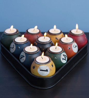 Who says men can’t dig candles? This pool-inspired set of tea light holders is a funky accoutrement to any guy’s games’ room / office / man cave, etc. Make sure to pair it with a pack of not-too-feminine candles!