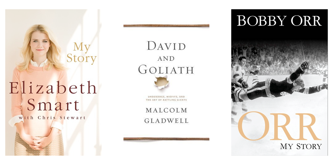 Number One on my list is ‘David and Goliath’, by Malcolm Gladwell. Tied for second place are ‘My Story’ by Elizabeth Smart and ‘Wheelmen’ by Albergotti & O’Connell.