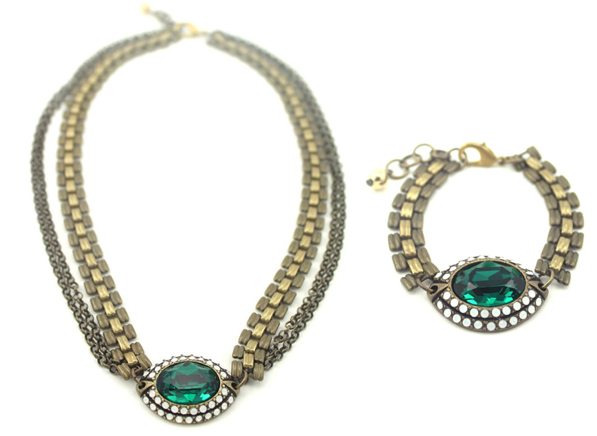 Shop for Jayu regularly takes a motif from one piece and applies it to different pieces. The result is you can pair the pieces for a totally coordinated look, or if you really love how a design looks on a necklace, can apply it to another piece to wear with other outfits, so you’re not repeating the same accessory. Or if you love a look but aren’t a necklace wearer – rest assured, it’s often replicated in some other form. Such is the case with these slightly art deco-inspired pieces. A bold splash of emerald green is set off by elegant beading and edgy metal chains – again making that perfect balance of hard meets soft.