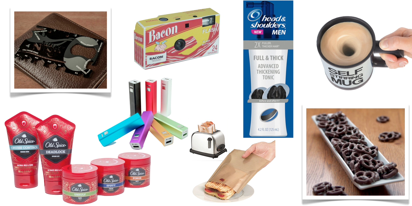 I like Old Spice Styling Products, Chocolate Dipped Pretzels and Schatzii Power Sticks for him.