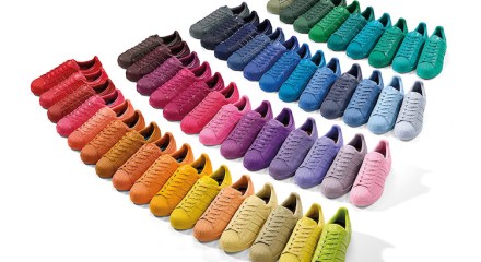 adidas and Pharrell have teamed up to rework the brand’s signature Superstar shoe in 50 different shades – from lemon yellow to dusky blue.