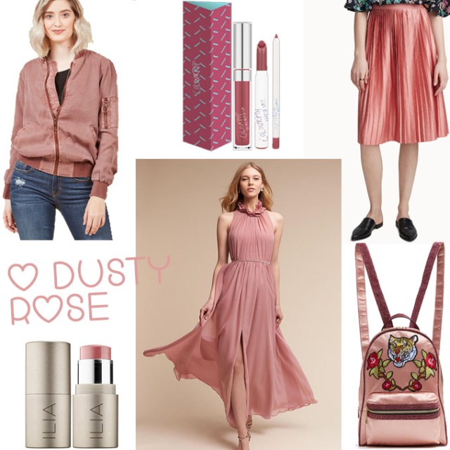 I don’t wear a lot of dusty rose, but I like it. My favourites are the Ilia Multi-Stick from Sephora, and the Camila Dress from Anthropologie.