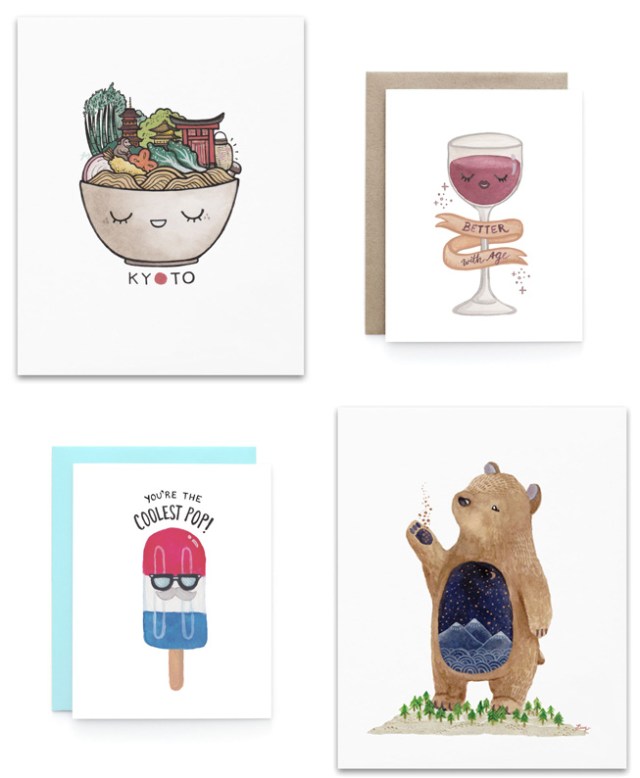 What It Is: There are essentially two streams to what Art and Soul Creative Co. produces: Greeting cards and prints. The former has a bunch of different categories, from the essentials like birthdays and congratulations, to more offbeat choices like encouragement and love / friendship. All of the cards feature a beautiful, whimsical design on the front and a blank inside, and retail for $5.50 a pop. I have to say that I am a huge fan of nerdy puns (do you read this blog?) so naturally, I love the fusion of visuals + wordplays to create designs that simply make you smile; like the ‘Coolest Pop‘ card above or the cheeky ‘Better With Age‘ card for your favourite wino (similar – a really cute cheese-themed card that also tops my list!)