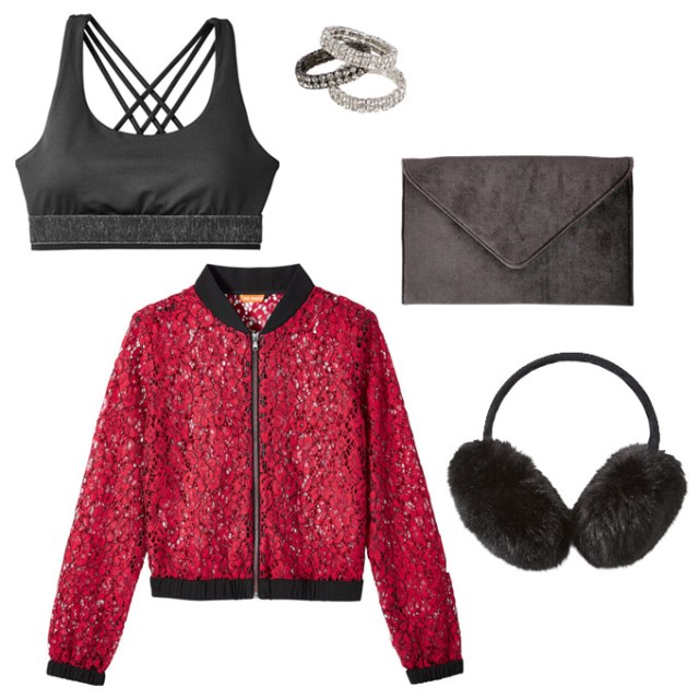 Joe Fresh Holiday Line Items – Sports Bra ($19), Rings ($16), Velvet Clutch ($29), Lace Bomber Jacket ($49), Faux Fur Earmuffs ($24)